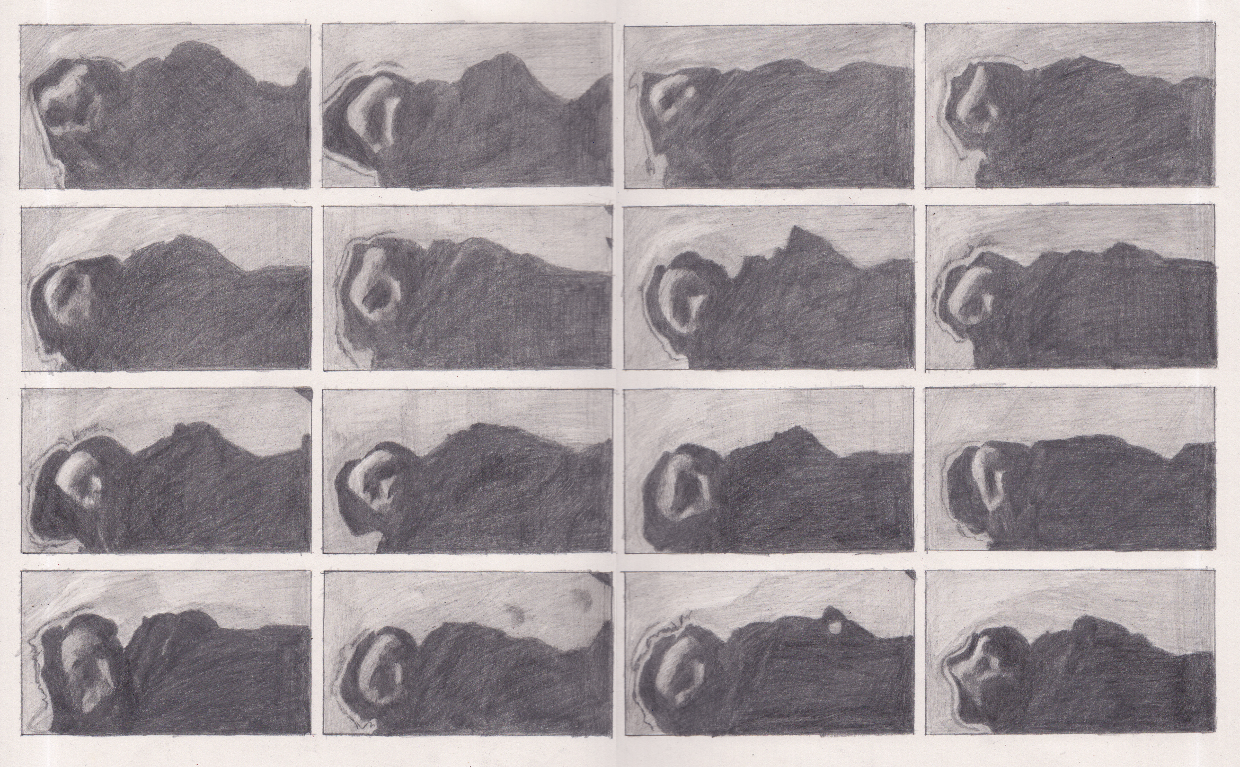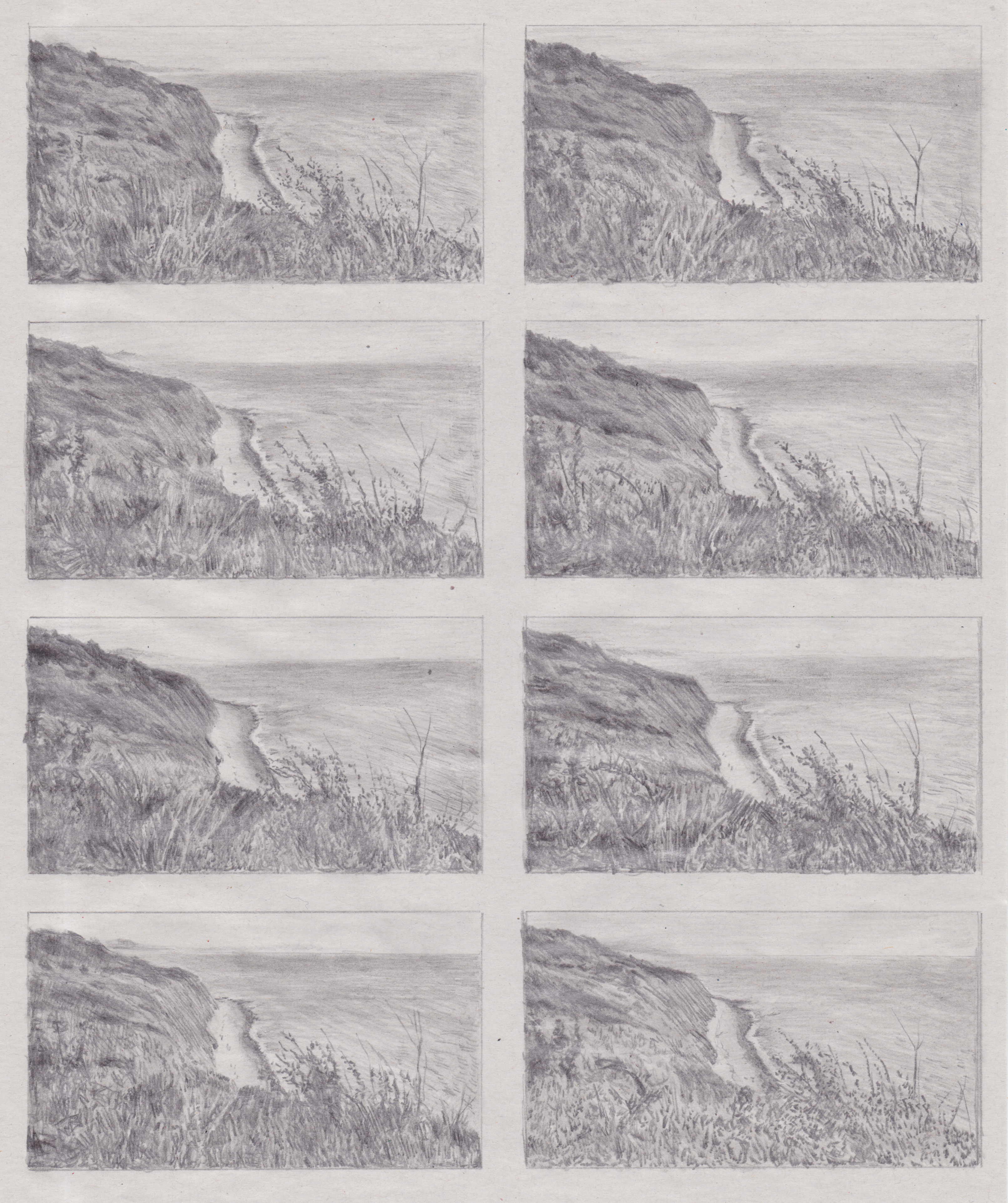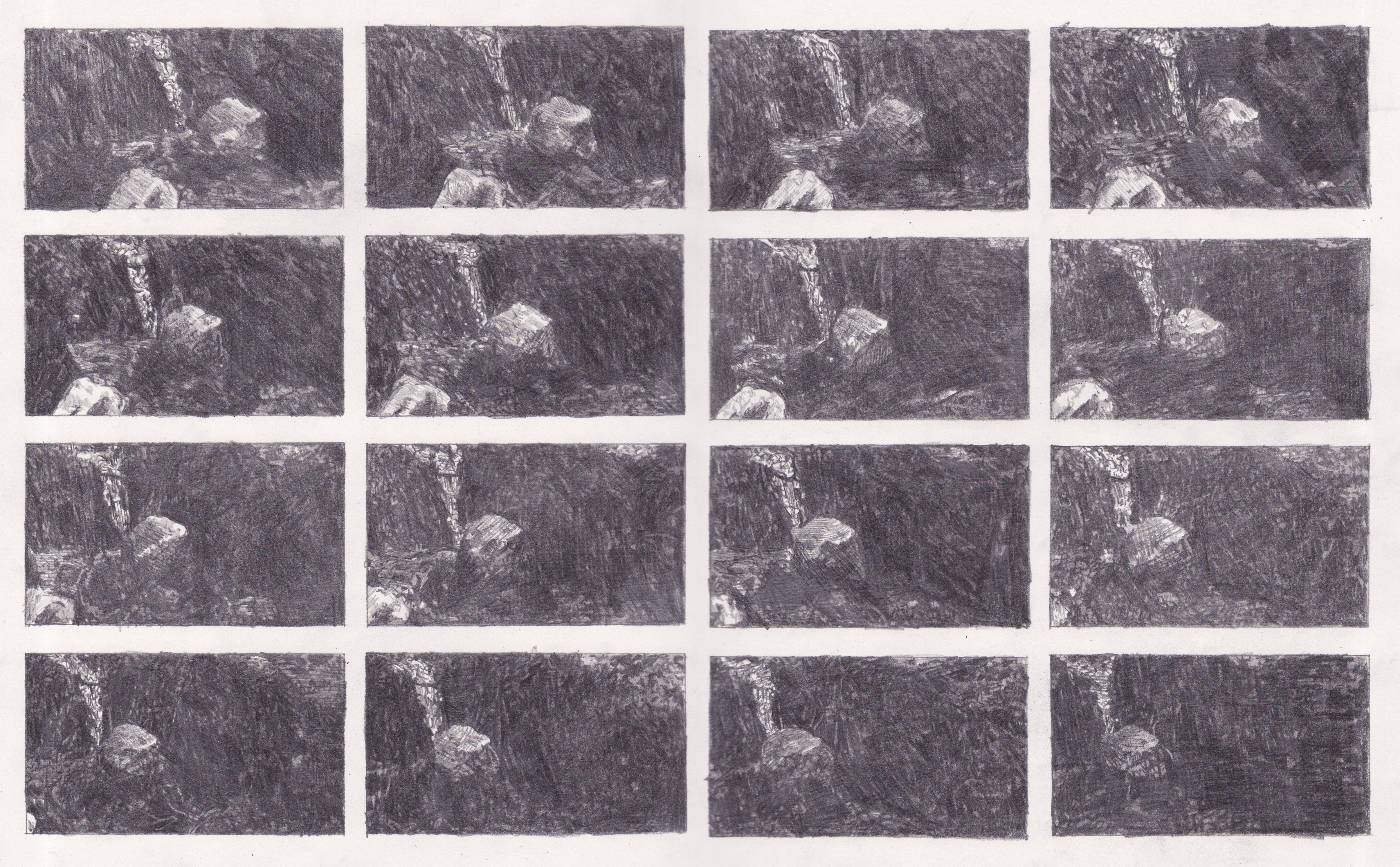 I began by recording footage of the undercliffs and rock pools along Axmouth beach (Devon, England) and collecting field recordings of the Jurassic coast path. I then selected the footage to be rotoscoped and, after cropping/altering the composition, printed out the frames onto A3 paper. Once the frames were drawn over, the finished drawings were scanned back onto my laptop and arranged into the final animation.