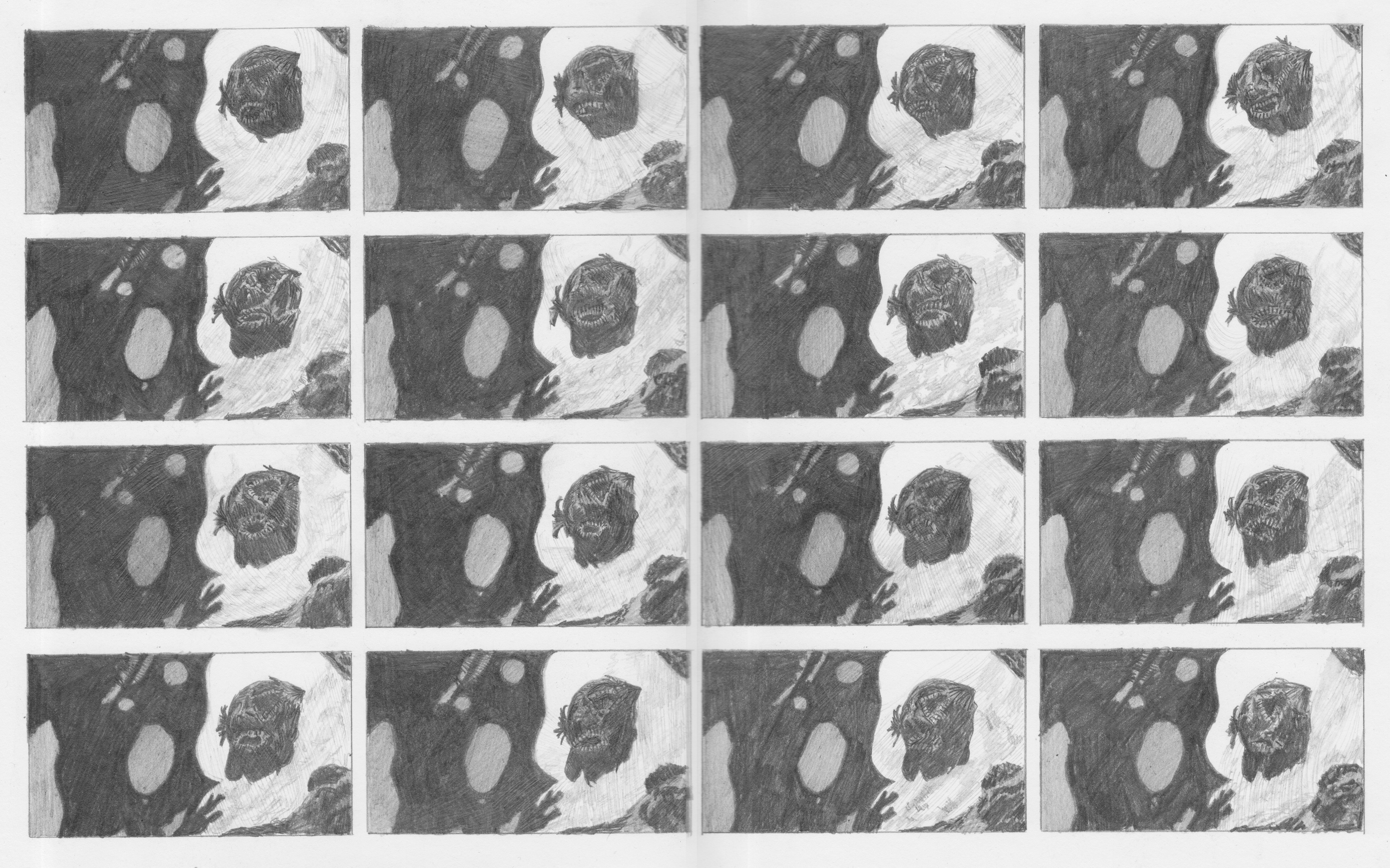 Rotoscoping also allowed me to bring in model making/stop motion animation into the project without completely changing the tone of the film. After constructing a face with canvas and painting it to resemble seaweed, manipulating its mouth movements and taking photographs to form an animated sequence, I printed out the frames and drew over my stop motion footage. By redrawing the sequence, I condensed the detail of the stop motion footage so as not to interrupt the tone created by the previous pencil-drawn sequences.
